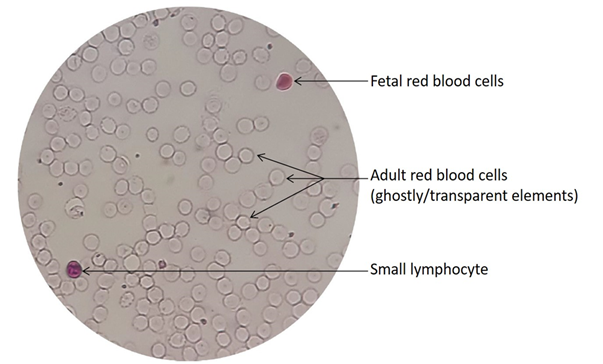 After acid treatment, the HbF remaining in the red blood cells is stained with a pink dye, so the red blood cells containing HbF can be distinguished from the uncoloured HbA containing maternal red blood cells.
